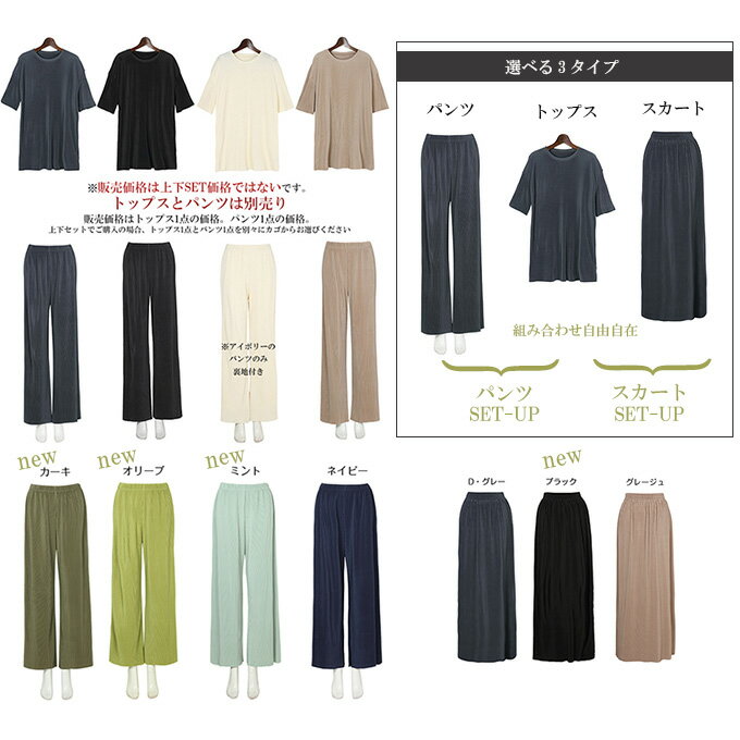 ■素材 サラリとしたプリーツ生地 ポリエステル95% スパンテックス5% ■仕様 【トップス】 クルーネック 半袖 オーバーサイズ プルオーバー 【パンツ&スカート】 ウエストゴム ロング丈セルフカット可能 ■シーズン 春 夏 クルーネック 袖 ウエストゴム パンツ:裏地付き 裾:セルフカット可能 発送方法 ネコポス発送 トップス 肩幅43 バスト102 裾周り102 袖丈24 袖幅16 着丈69 スカート ウエスト66~100 ヒップ96 着丈95 パンツ ウエスト62~84 ヒップ100~ 太もも周り62~ 裾周り60~ 前股上35 股下70 後股上37 着丈98~100 素材 ポリエステル95% スパンテックス5% 伸縮性 程よく伸縮する 透け感なし。
