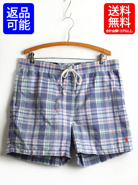 ■ POLO ポロ ラルフローレン チェック スイム ショートパンツ ( 男性 メンズ M ) 古着 ショーツ 海パン 水着 総柄 スイムショーツ 短パン| 【USA古着】中古 インナー ナイロンショーツ 半パン 短パン 半ズボン サーフパンツ RALPH LAUREN サーフショーツ ポニー刺繍