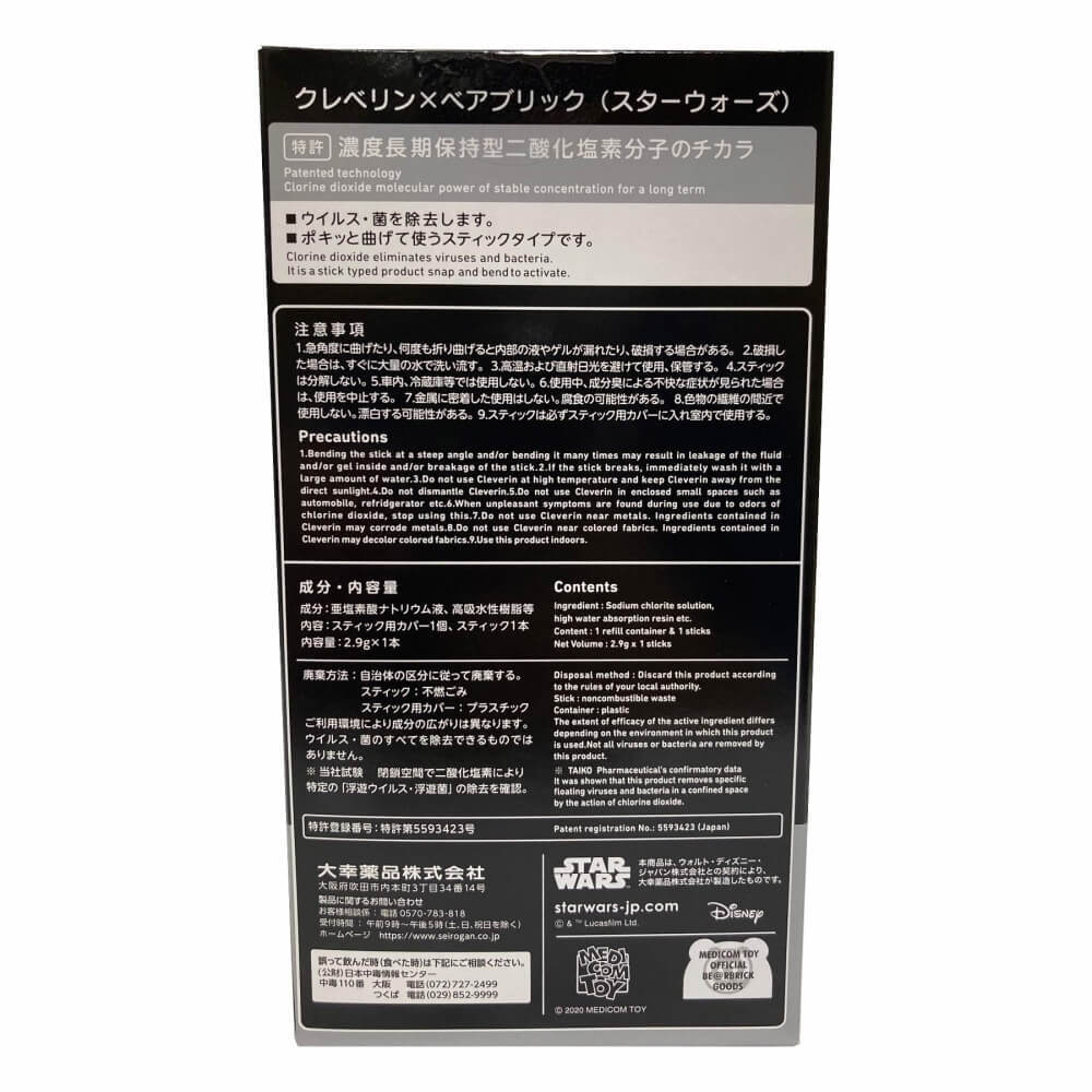 特許 濃度長期保持型 二酸化塩素分子のチカラ!二酸化塩素分子のチカラでウイルス・菌を除去する「クレベリン シリーズ」の新たなラインナップとして、クマ型ブロックタイプフィギュア BE@RBRICK(ベアブリック)とのコラボアイテム、「クレベリン×ベアブリック」にウォルト・ディズニー・ジャパン株式会社の限定デザインが登場!!「スターウォーズ」に登場するキャラクターバージョンとなります。